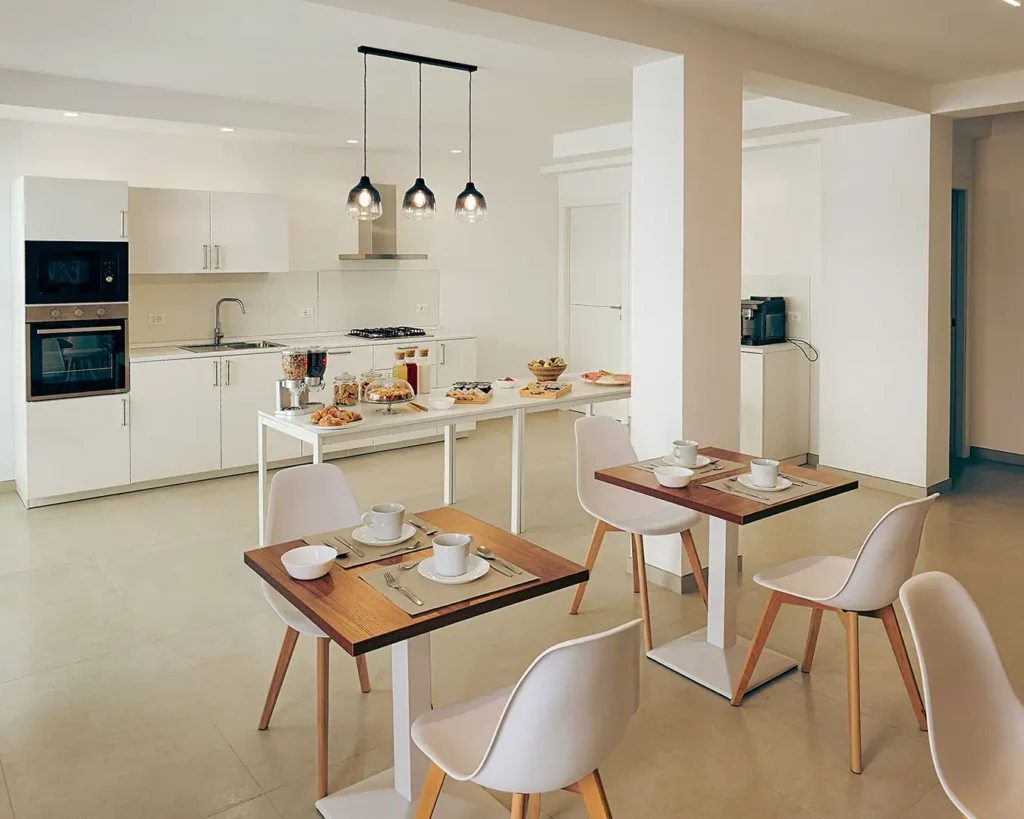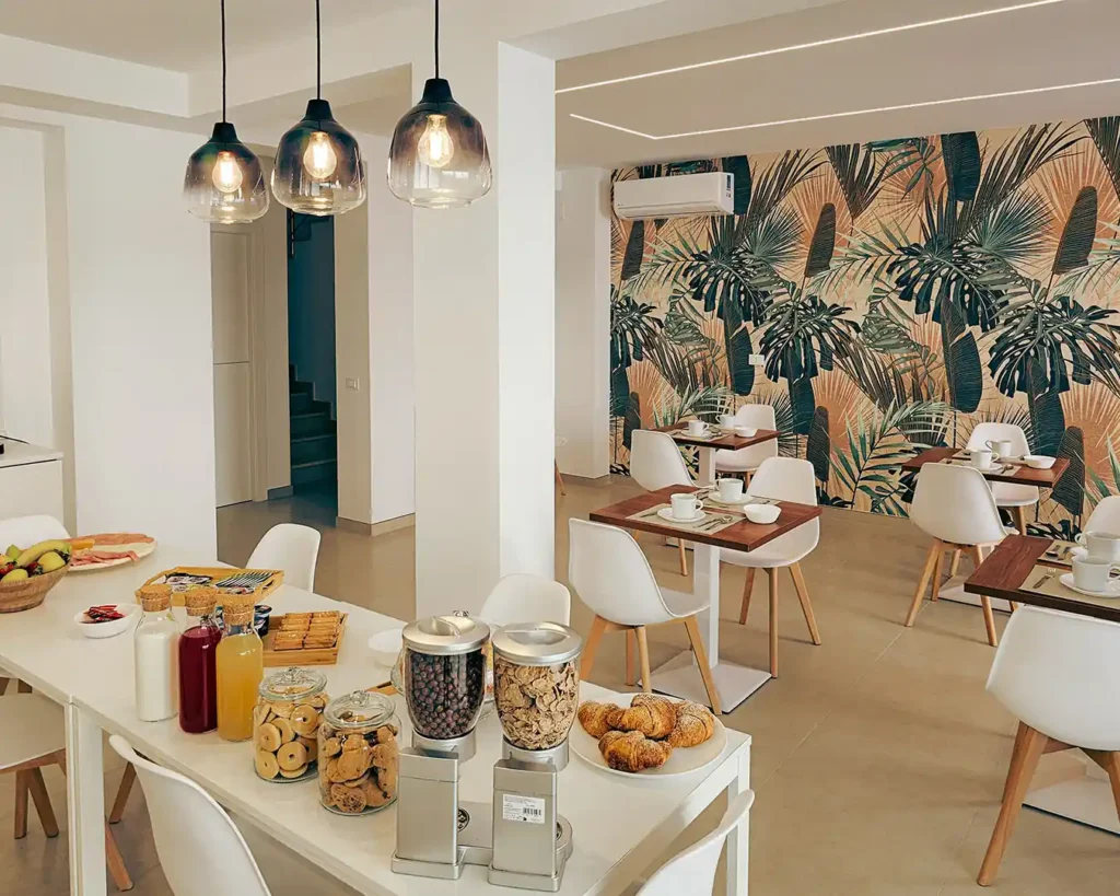 Le nostre camere sono moderne, luminose e dotate di ogni comfort, tutte con bagno privato. Ogni mattina potrai iniziare la giornata con una colazione in uno spazio ampio, elegante e rilassato, anche all’aperto.